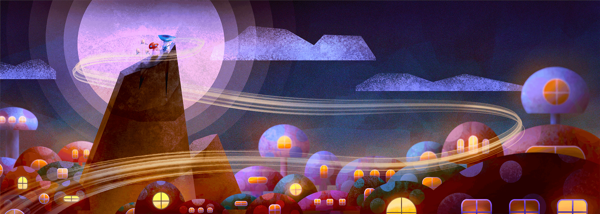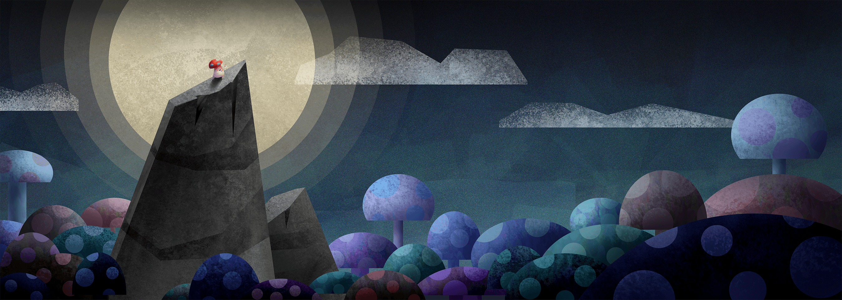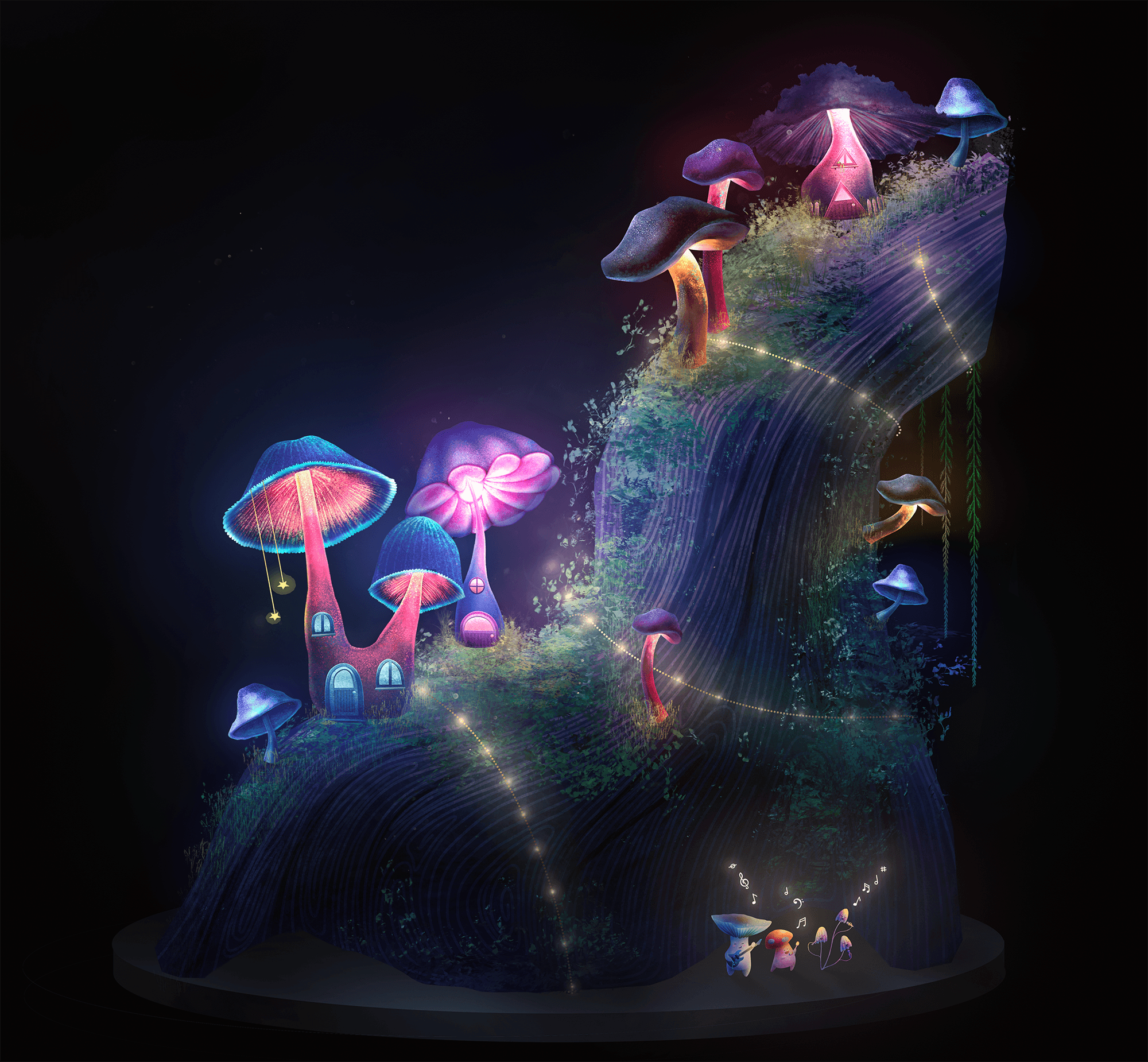 To help calm and ease the anxiety levels of pediatric patients during chemotherapy, virtual reality simulations were created to support this effort. This concept plays on the world of imagination with mushrooms and music. In this simulation, these characters play relaxing music in synchronization with the lights of the forest.