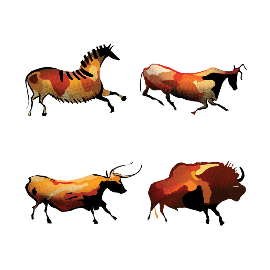 Inspired by the history of the Lascaux cave paintings in France, I designed four small spot illustrations to emulate what was painted on the walls of this historic site.