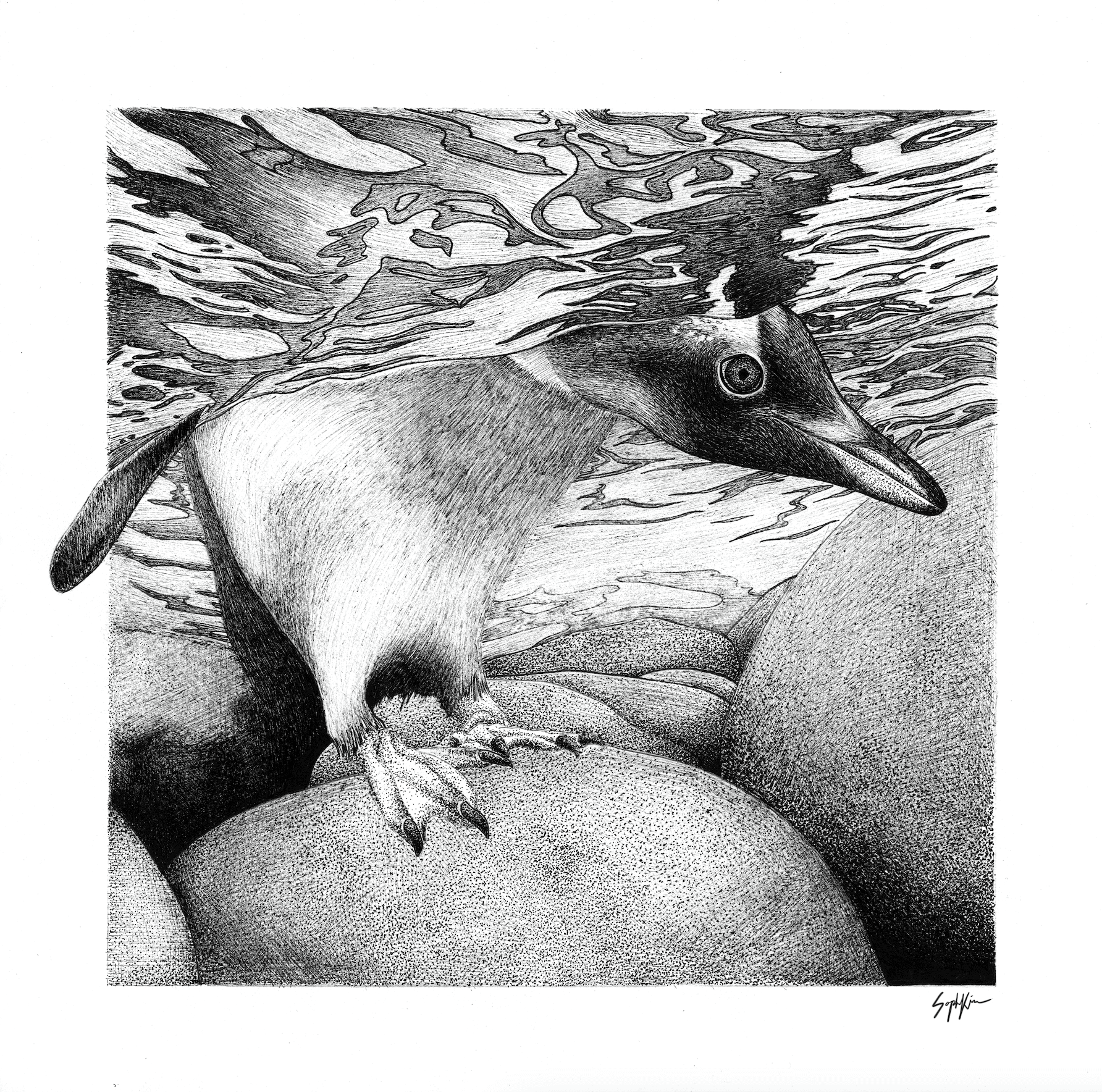 Ink illustration of a penguin underwater with ink stippling and stylization. Photo reference from Paul Nicklen.